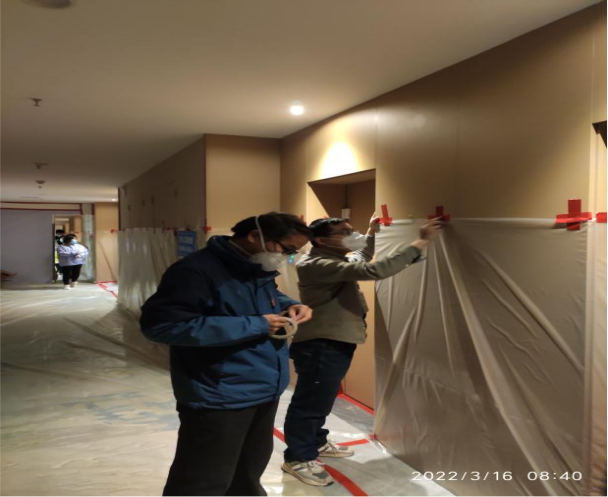時(shí)間緊,任務(wù)重,公司8名干部員工,其中2名黨員干部率先垂范,堅(jiān)守布置現(xiàn)場(chǎng),不達(dá)標(biāo)準(zhǔn)不撤場(chǎng)。5天時(shí)間,完成8個(gè)點(diǎn)位,40多種材料,3萬多平米光面材料布置,8百多平米硬隔離墻搭建,1千多平隔離通道搭建,6百多塊標(biāo)識(shí)標(biāo)牌設(shè)計(jì)制作安裝,20多間醫(yī)廢間設(shè)置,1千多塊門磁安裝,4百多個(gè)監(jiān)控安裝等工作。同時(shí),給各隔離點(diǎn)位及時(shí)配送隔離期間辦公用品及生活用品包括牙膏、臉盆、被褥、方便面等100余種。