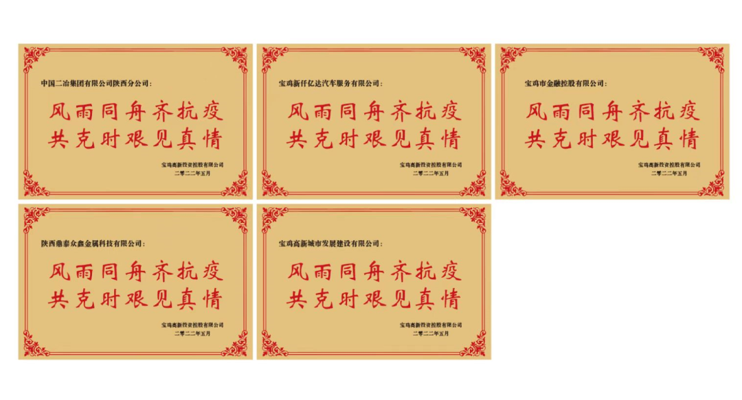 在今年3月新冠肺炎疫情防控工作中,愛心企業(yè)中國二冶集團有限公司陜西分公司、寶雞新仟億達汽車服務(wù)有限公司、寶雞市金融控股有限公司、陜西鼎泰眾鑫金屬科技有限公司、寶雞高新城市發(fā)展建設(shè)有限公司勇于承擔社會責任,雪中送炭,為集團公司一線干部員工捐贈防疫物資,凝聚起眾志成城、共克時艱的強大力量,為集團疫情防控工作做出了重要貢獻。近日,集團公司為愛心企業(yè)送去紀念匾牌,表達對他們的感謝之情。