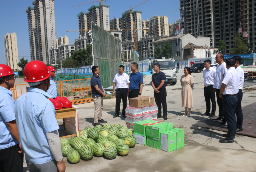 7月7日上午,集團(tuán)領(lǐng)導(dǎo)班子一行慰問了一線環(huán)衛(wèi)工作者、一線施工人員,并來到高新一路濱河路無障礙設(shè)施人行過街天橋項(xiàng)目、八魚鎮(zhèn)范家崖棚改及科技新城鈦及新材料產(chǎn)業(yè)園項(xiàng)目現(xiàn)場(chǎng),檢查項(xiàng)目進(jìn)度、安全生產(chǎn)、防疫防汛防暑等工作落實(shí)情況,為一線工作者送上西瓜、藿香正氣水等防暑降溫物品。對(duì)他們?cè)诟邷乜崾钐鞖庀氯詧?jiān)守一線表示感謝,同時(shí)叮囑他們做好高溫防護(hù)措施,確保平安度夏。